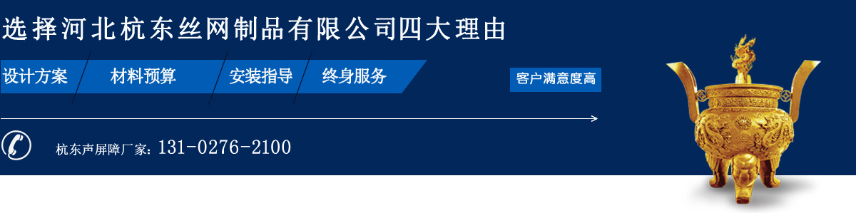 河北杭東絲網制品有限公司是一家專門從事公路交通,軌道交通及民用降噪用、隔聲板、吸聲板、消聲片、輕鋼結構隔音屏障的綜合性基地的企業。公司坐落于河北省饒陽縣,緊鄰一條國道,兩條高速,交通便利,物流發達。